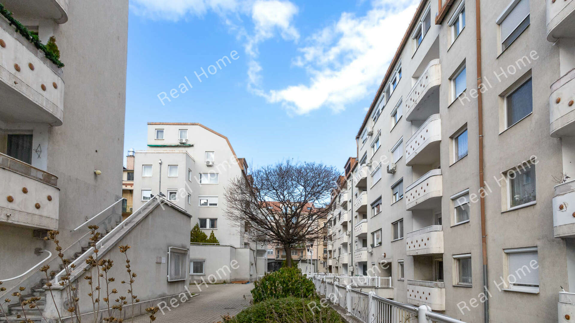 A gyalogos szinten elhelyezkedő macskaköves sétány a kihelyezett padokkal és a lakóközösség által gondozott zöldfelületekkel olyan nagyvárosra nem jellemző atmoszférát teremtenek, amelyet ritkán tapasztalhatunk máshol. A félköríves középső terület és az épületek alsó utca felett átfutó hidas bekötése izgalmas térhelyzeteket teremt, ami a mai napig igazán értékessé és megismerhetővé teszi a házat.